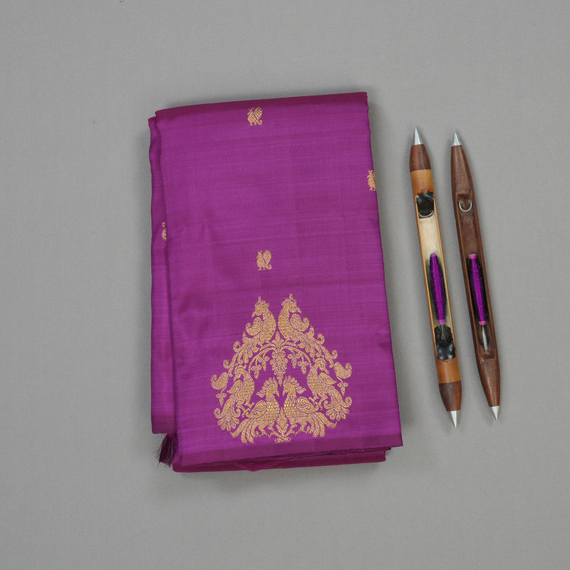 Presenting a stunning display of elegance, this Pure Handloom Silk Saree is a magnificent purple monochromatic creation, making it perfect for brides seeking a regal yet unique look. The rich hue is beautifully broken by intricate details, including a karai butta border which is exquisitely adorned with six-peacock motifs.