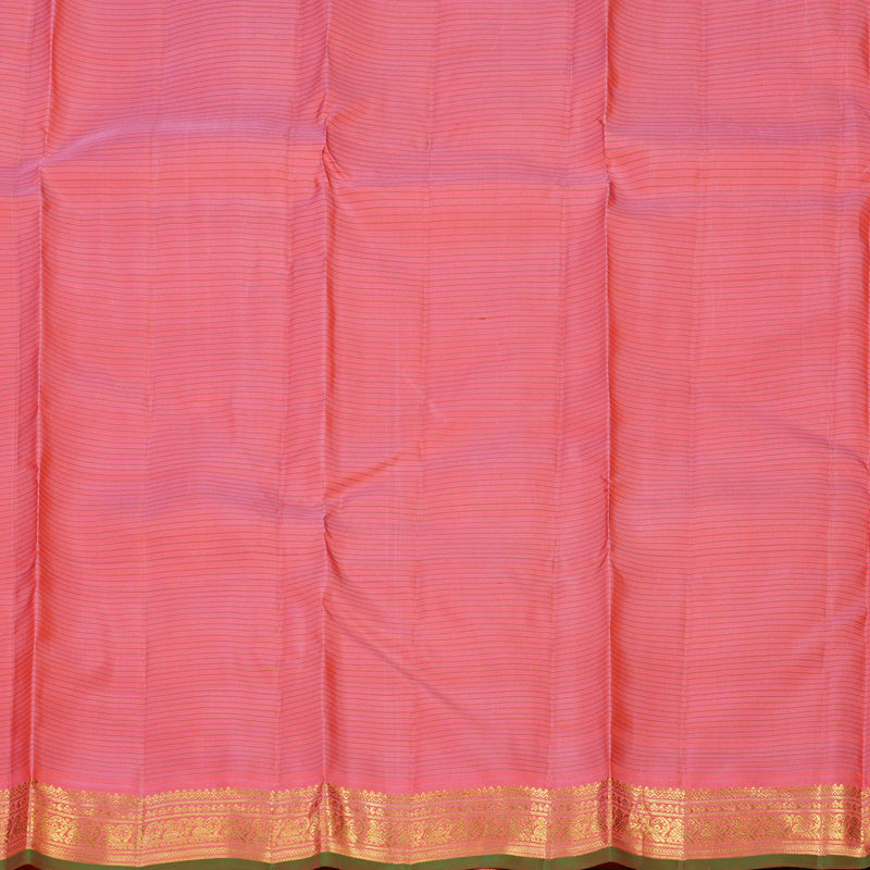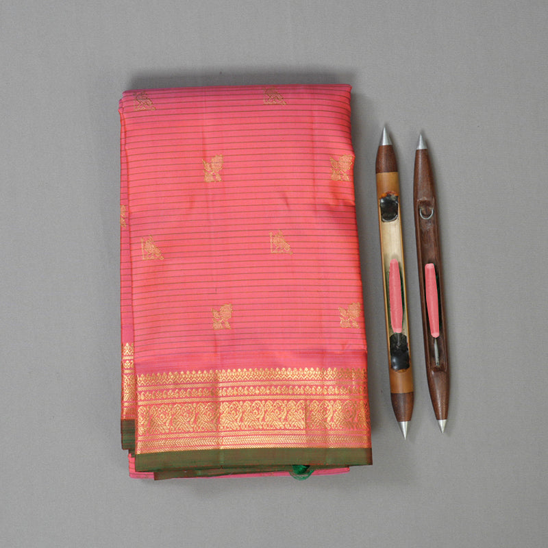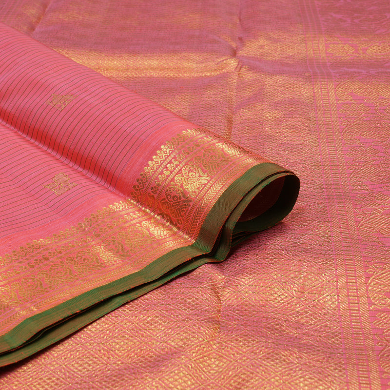 Discover refined elegance in this Kanjivaram silk saree, where rose pink meets intricate craftsmanship. Delicate horizontal thread lines traverse the body, interspersed with graceful peacock buttas that evoke timeless beauty. The vintage-inspired border, enhanced by traditional manthalir selvedge detailing, adds authentic character and heritage appeal.