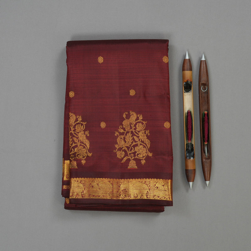 Step into the classic grandeur of this rich Araku Maroon Bridal Vintage Kanjivaram Silk Saree. The body features delicate floral motifs, while the border is heavily woven with traditional elephant and peacock motifs. This is a powerful, auspicious colour and motif combination perfect for momentous occasions.
