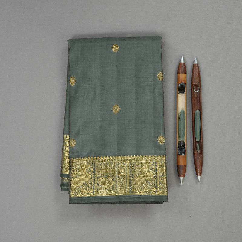 This elegant Vintage Kanjivaram Silk Saree in a sophisticated Elephant Grey features subtle small buttas woven across the body. The border is beautifully detailed with traditional yaazhi and peacock motifs, symbolizing mythical power and grace.