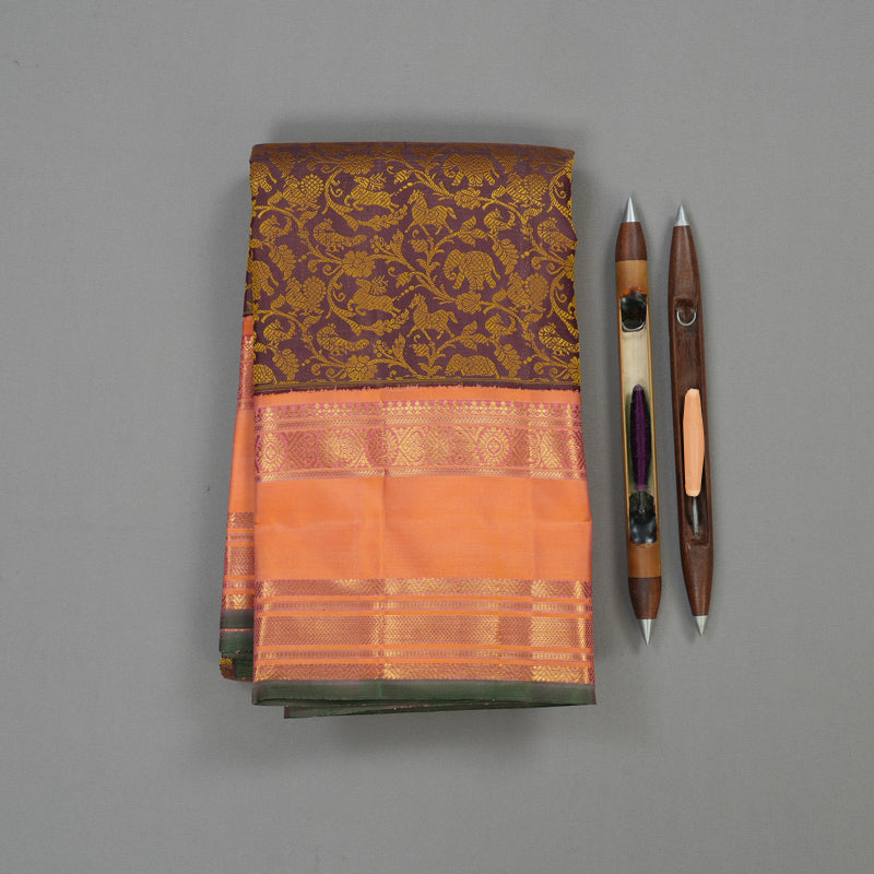 Discover the narrative beauty of this Faded Purple Bridal Korvai Contrast Kanjivaram Silk Saree and its bright Peach Orange border. The body is entirely woven with intricate Vanasingaram motifs (mythological forest), while the Rettapet border is richly detailed with traditional motifs, making the saree a living story.