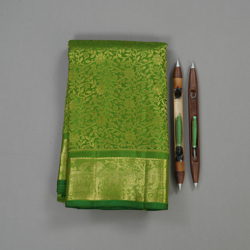 Priced at a premium of ₹110,720, this extraordinary saree is a masterpiece for the main bride's ceremony or a grand cultural gala. The rarity and complexity of the narrative border design, combined with the all-over floral pattern, cement its status as a highly valuable, artistic heirloom.