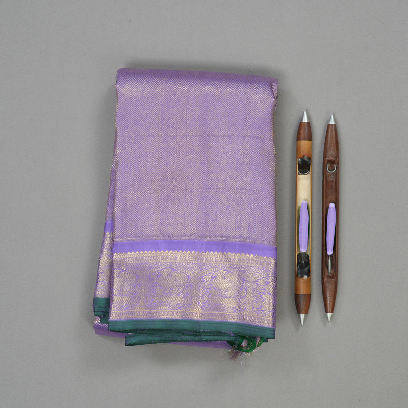 An ethereal, opulent look defines this unparalleled Lavendar Bridal Vintage Kanjivaram Silk Saree. This pure silk heirloom features a dramatic chevron pattern all over the body, and the border showcases majestic annapakshi motifs. This is a haute couture Kanjivaram for the most discerning bride.