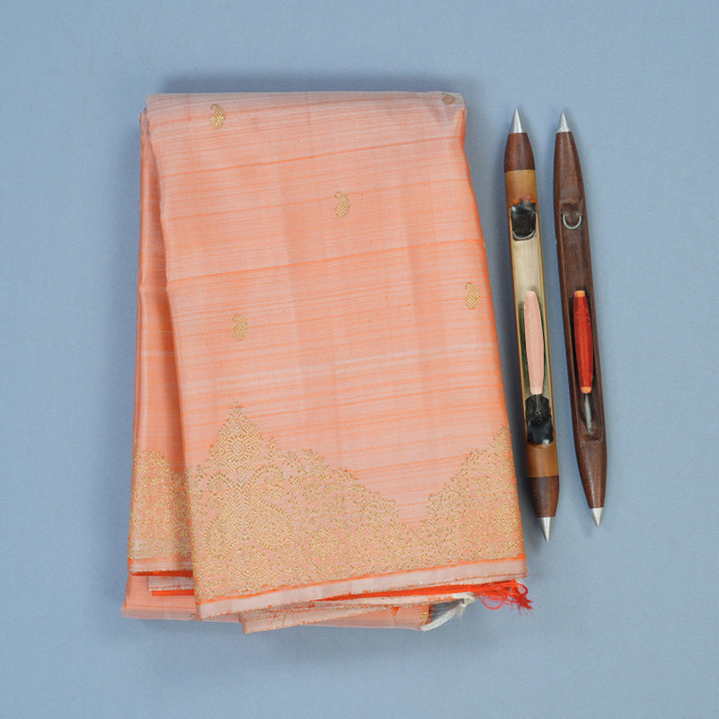 This Handloom Bridal Kanjivaram features a radiant peach orange body adorned with delicate paisley motifs. The saree is defined by an intricately woven turning border, showcasing a seamless and masterful transition of traditional patterns that frame the silhouette with majestic grace.