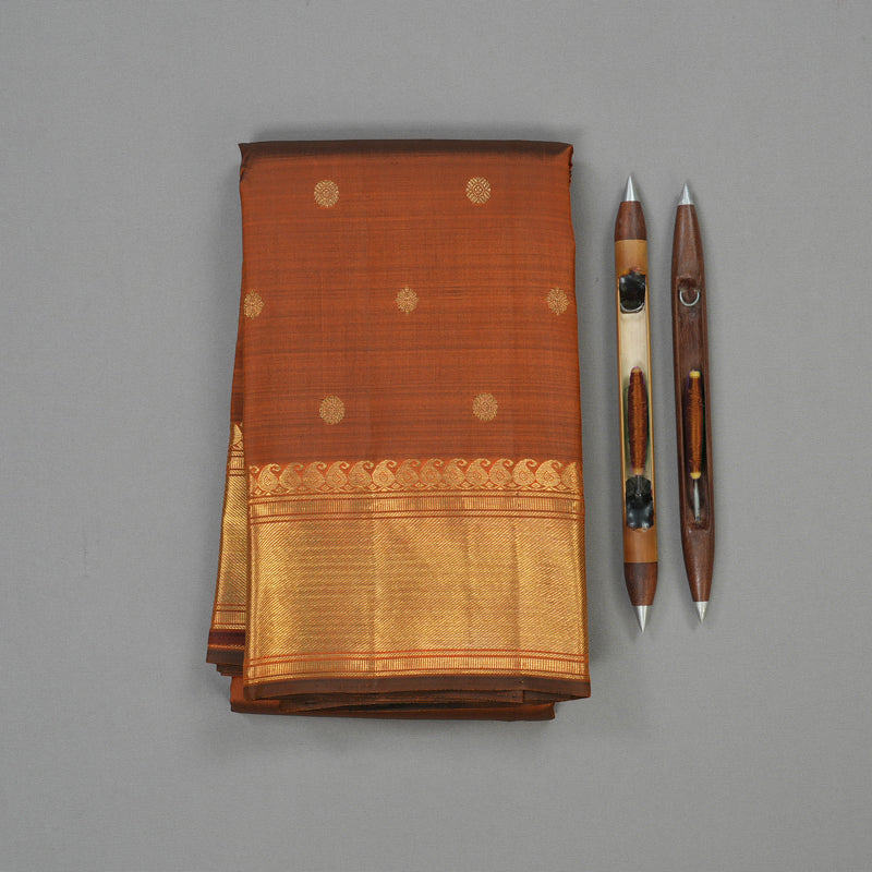 Discover the rich, earthy elegance of this Bridal Vintage Rust Orange Kanjivaram Silk Saree. The body features delicate small floral buttas, and the heavy border is subtly woven with small buttas, creating a refined, all-over textured look.