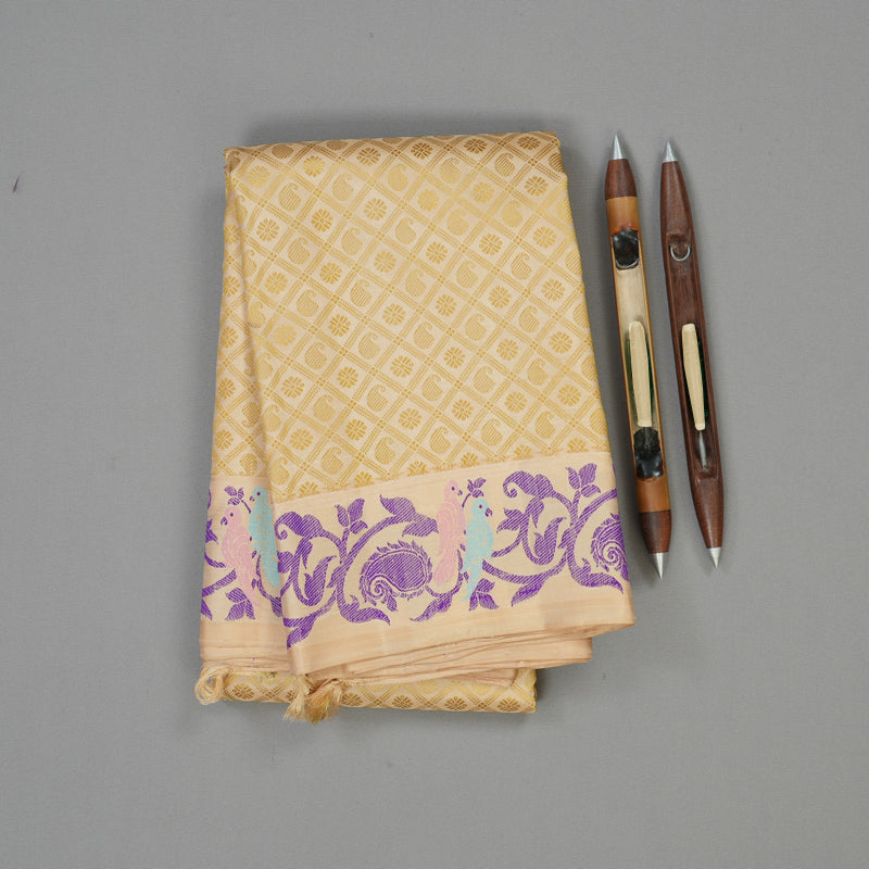 Exude a serene and sophisticated charm in this sandal-colored Handloom Kanjivaram silk saree, featuring intricate diagonal thread checks interspersed with delicate paisley and floral motifs. The design is elevated by a vibrant border adorned with cheerful thread work, showcasing floral patterns and two graceful parrots in a masterfully woven display.