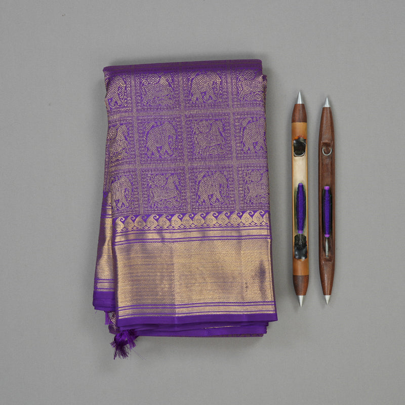 A deep, shimmering look defines this elegant Deep Violet vintage Kanjivaram Silk Saree. This pure silk heirloom features grand woven jari checks with Horse and elephant motifs inbetween the checks on the body and a traditional border.