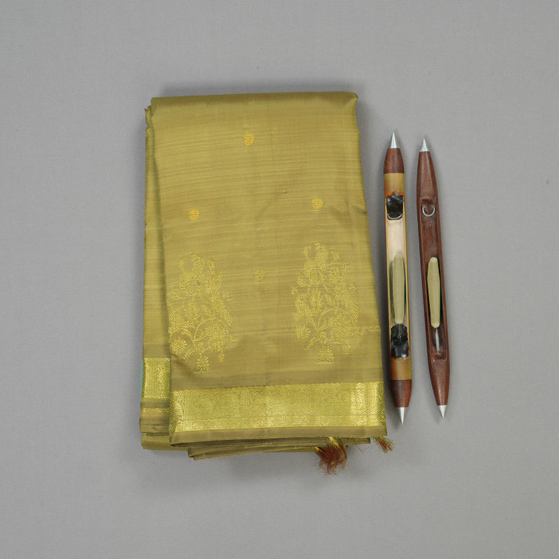 A rare, luxurious tone defines this magnificent Warm Olive Bridal Vintage Kanjivaram Silk Saree. This premium bridal silk features majestic peacock motifs woven richly into the border, ensuring an opulent and grand drape. This is an ideal pure silk saree for brides, wedding attendees, and heirloom collections.