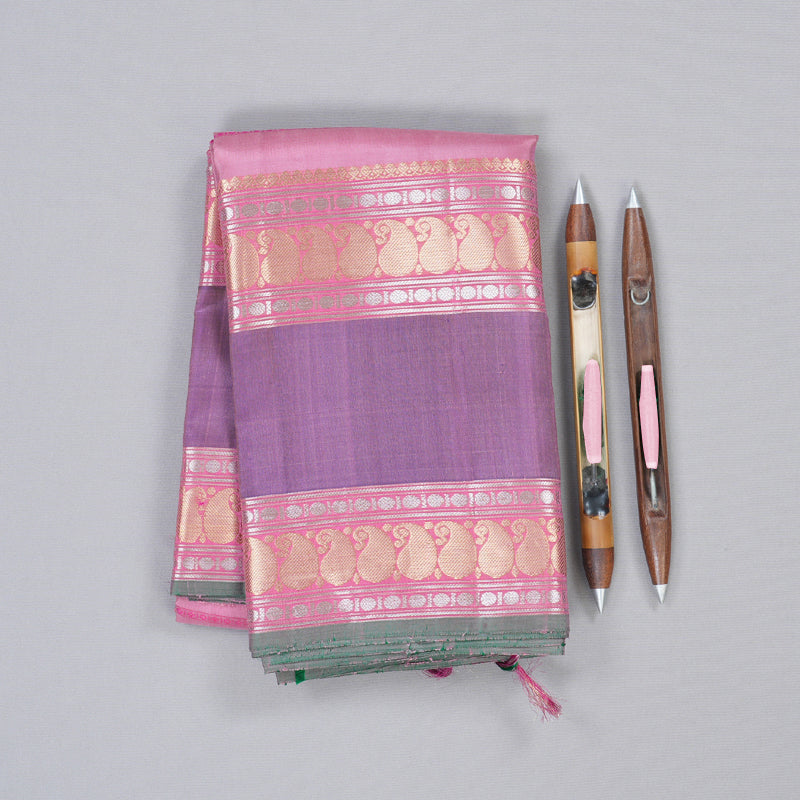 An exquisite Vintage Kanjivaram Silk Saree, this Baby Pink drape is adorned with a striking Purple Border in the Retta Pet style. The Paisley motifs woven throughout enhance its elegance, making it a graceful choice for special occasions.