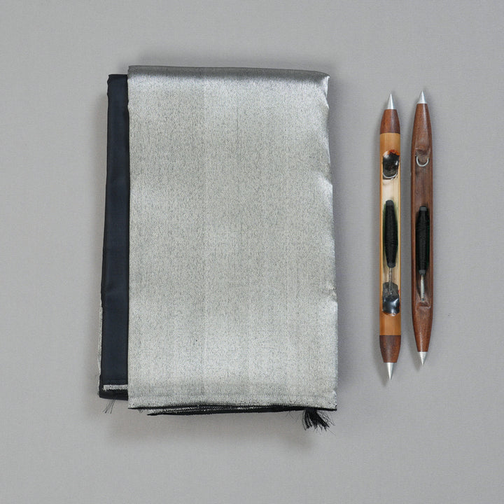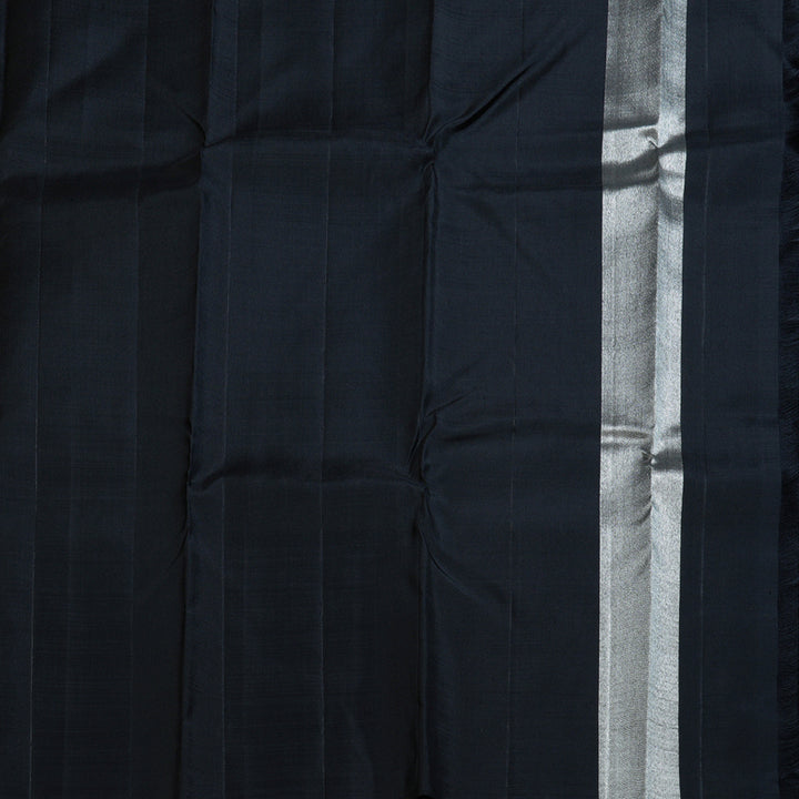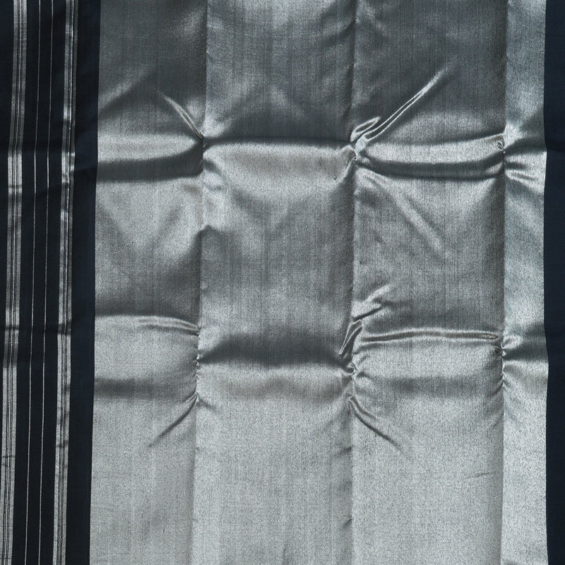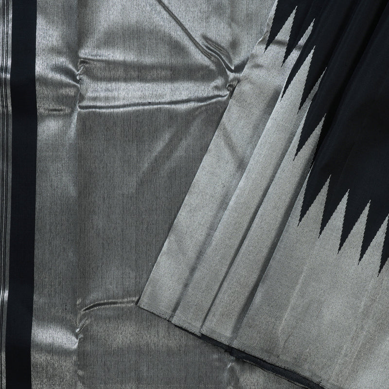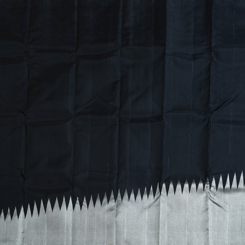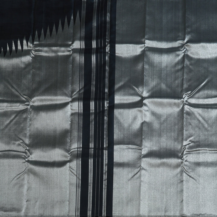 A true collector’s piece, this Black Kanjivaram Silk Saree features Raising Temple Borders, an iconic design that symbolizes prosperity and grandeur. Ideal for weddings and traditional gatherings, this saree is best styled with bold gold jewelry. The jari work is fully in silver tone.