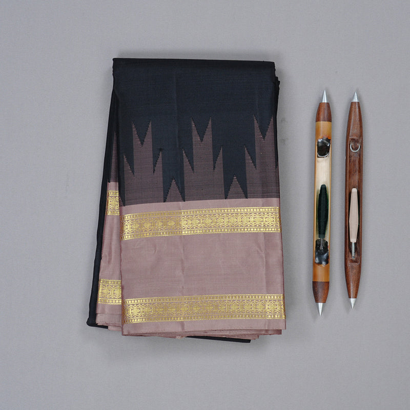 Step into timeless sophistication with this vintage black Kanjivaram silk saree featuring a rich chocolate brown border. Adorned with traditional gopuram motifs on a classic retta pet border, this masterpiece from Hayagrivas is a celebration of South Indian artistry. Handwoven to perfection, it’s ideal for festive occasions and cultural ceremonie