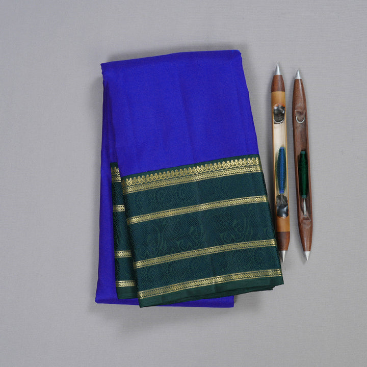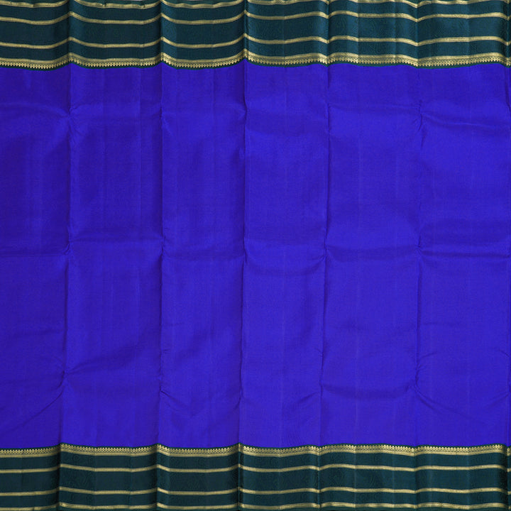 Make a bold statement with this blue Kanjivaram silk saree, complemented by a vibrant peacock green border. Ideal for festive occasions, its intricate handloom design adds an elegant touch to your ensemble. The border of this saree has a varisai pettu design with jari strips and thread pattern between.