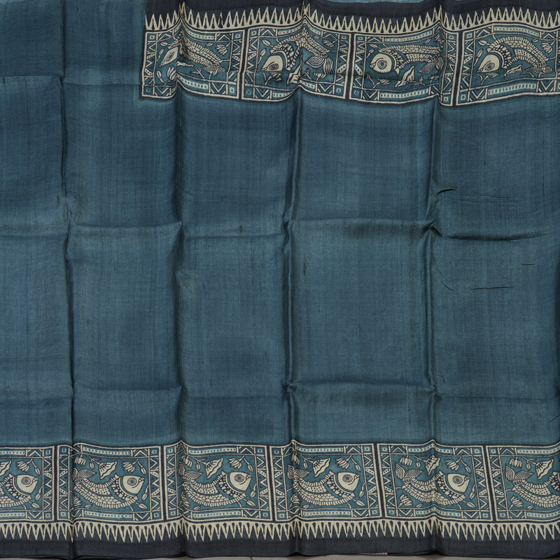 This is an elegant Pure Tussar Silk saree in a sophisticated bluish grey, featuring a self-contrasting dark grey pallu and blouse, perfect for casual occasions. It is distinguished by unique hand-painted prints and is priced at Rs.7,090, offering quality silk with handcrafted artistry.
