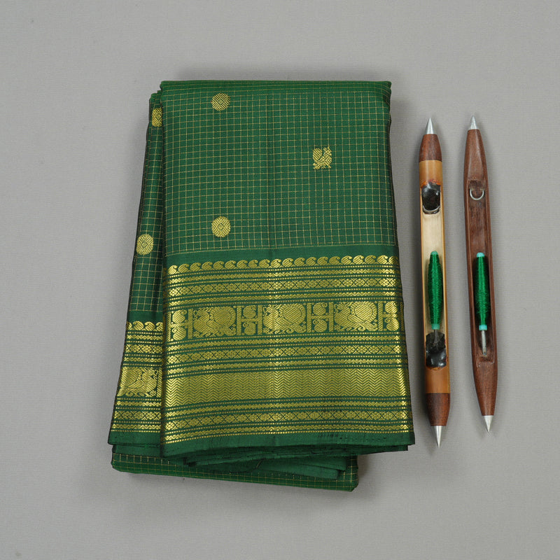 A stunning vintage Kanjivaram silk saree in deep bottle green, featuring exquisite jari checks throughout the body. The broad border is beautifully adorned with peacock, paisley, and traditional line motifs, reflecting skilled craftsmanship. Rich in texture and tradition, this saree is ideal for temple functions, weddings, and heritage celebrations. It offers a regal drape and a powerful visual statement. A true representation of timeless Kanjivaram artistry.