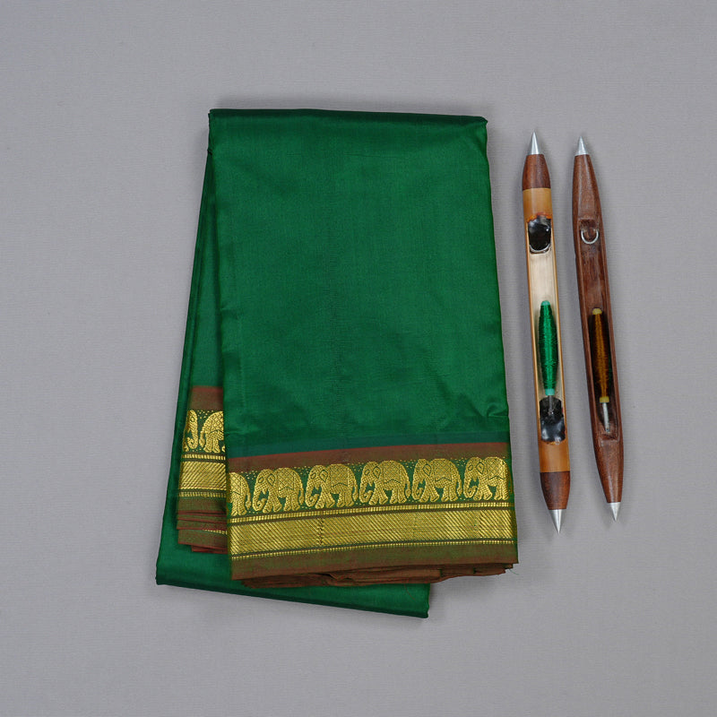 This Bottle Green Kanjivaram Silk Saree is a magnificent expression of heritage weaving, featuring regal elephant motifs on the Mandhalir Border. The deep, rich shade is enhanced by intricate detailing, making it a perfect saree for grand festivities, temple visits, and traditional celebrations.