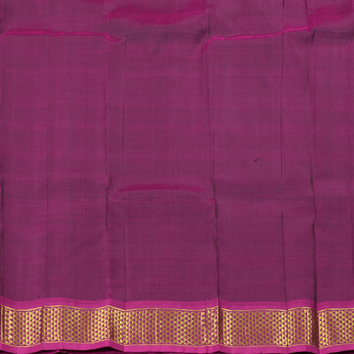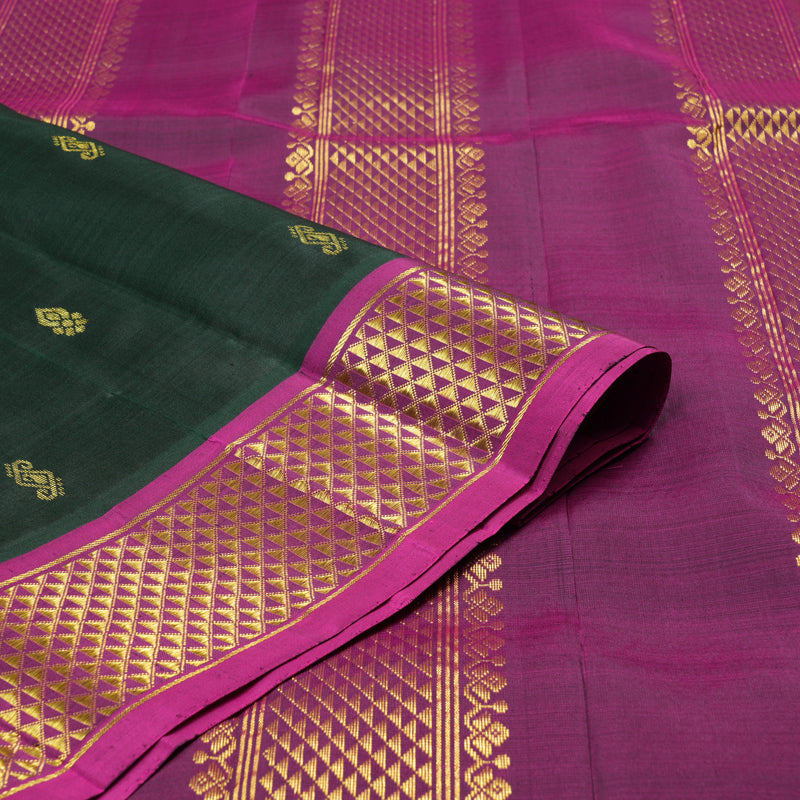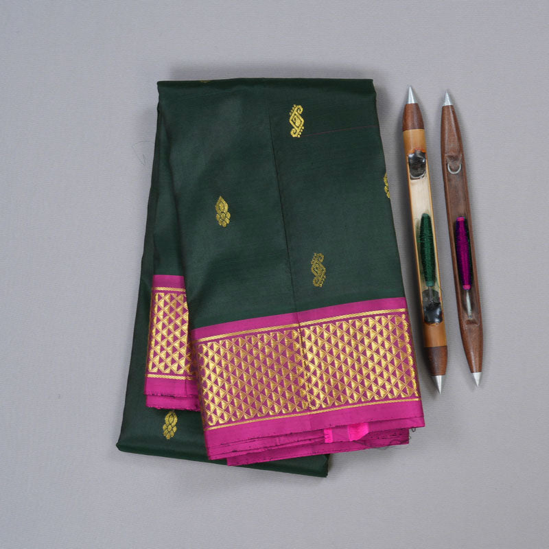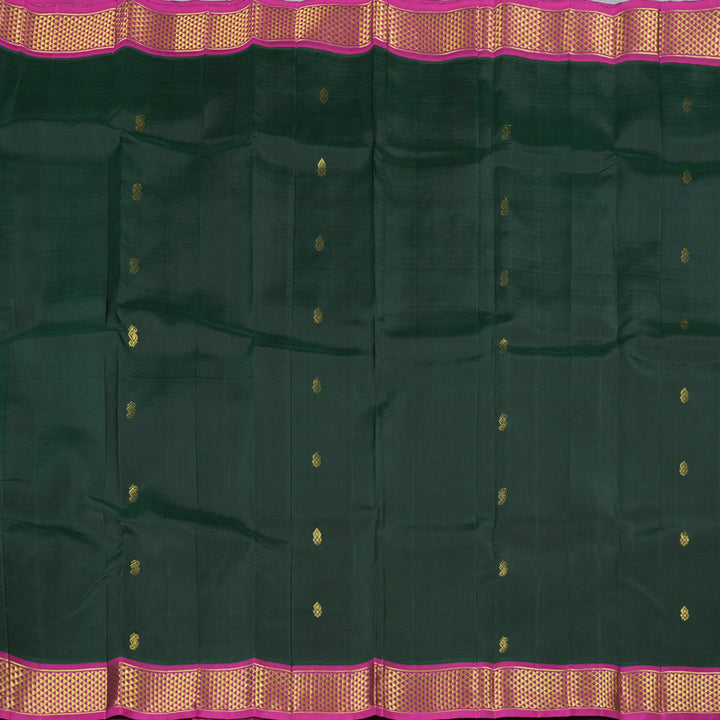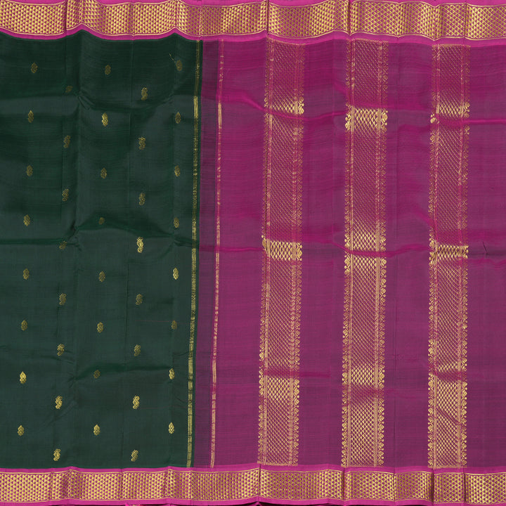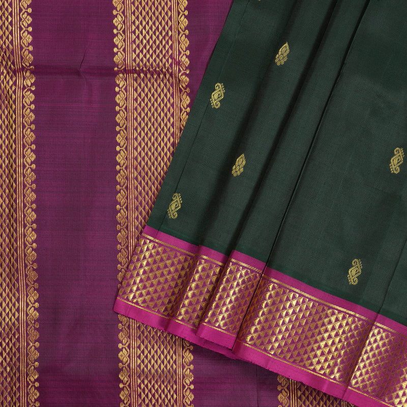 A deep and rich Bottle Green Kanjivaram Silk Saree, crafted with a Traditional Purple Border. This saree exudes elegance and grandeur, perfect for festive and formal occasions.