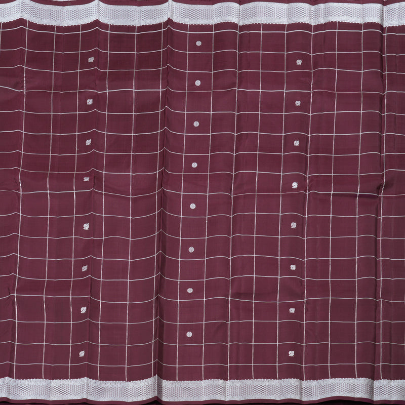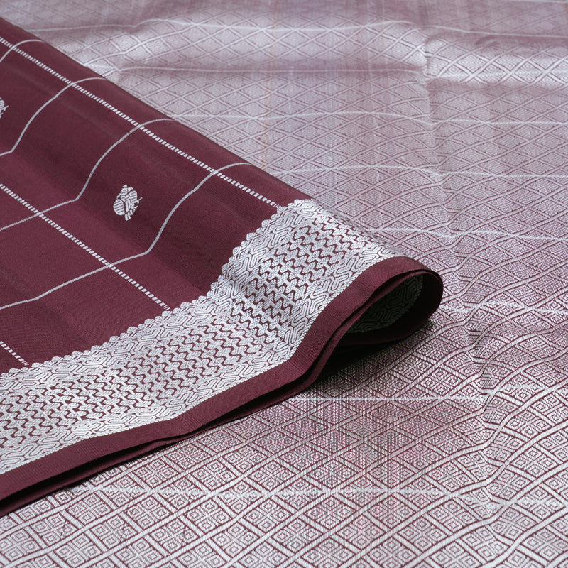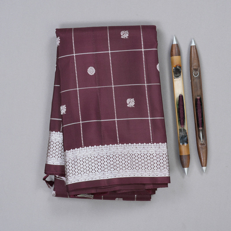 This Dark Brown Handloom Kanjivaram Silk Saree is a vintage masterpiece featuring Thread Checks and Peacock motifs on the body. A regal drape that blends tradition with elegance, perfect for weddings and cultural festivities.