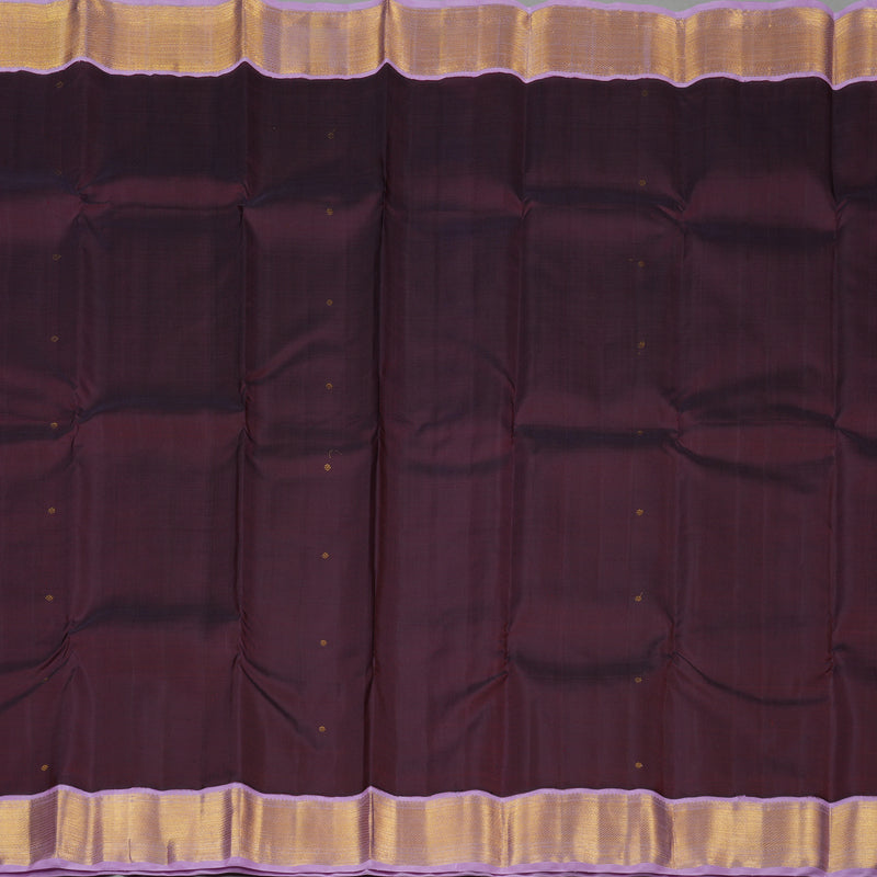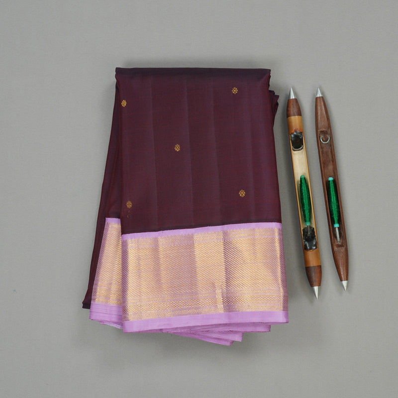 This dark brown korvai Kanjivaram silk saree is tastefully contrasted with a soft lavender border, adding a touch of subtle elegance. The body is decorated with small floral buttas, lending a delicate charm to the overall design. The interplay of earthy tones with pastel accents makes it ideal for both traditional and semi-formal wear. The weaving reflects a vintage sensibility infused with contemporary refinement. A beautifully balanced saree that is both graceful and distinctive.