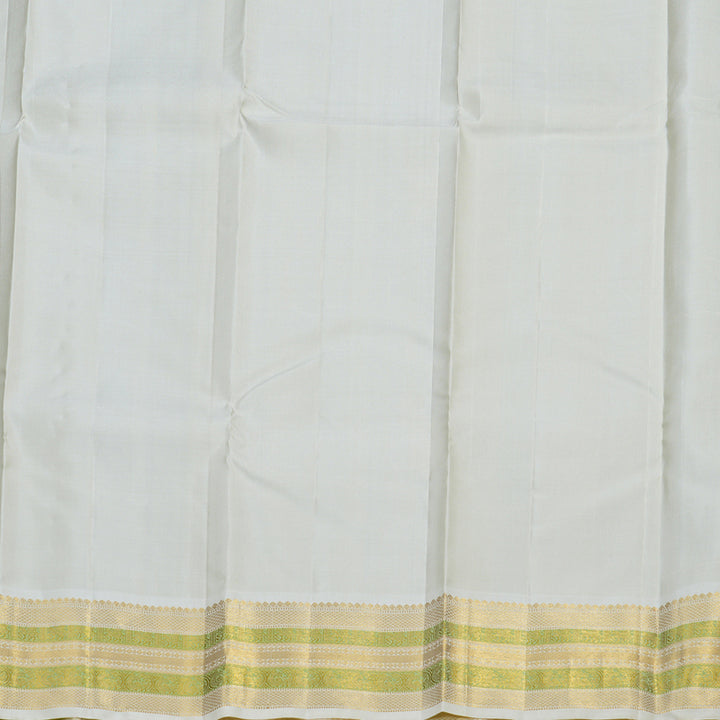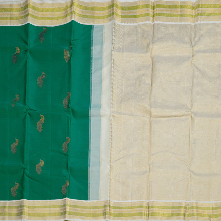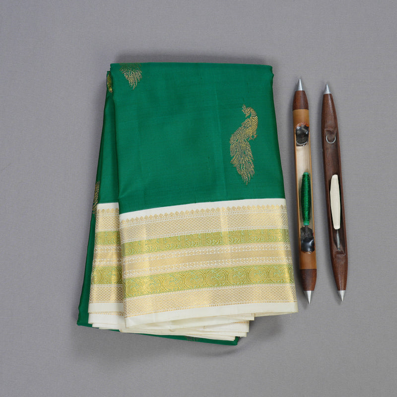 The dark green base with a contrasting half-white border, embellished with delicate peacock motifs, creates a stunning blend of tradition and sophistication. Perfect for weddings or festive occasions, this saree shines with temple jewelry.