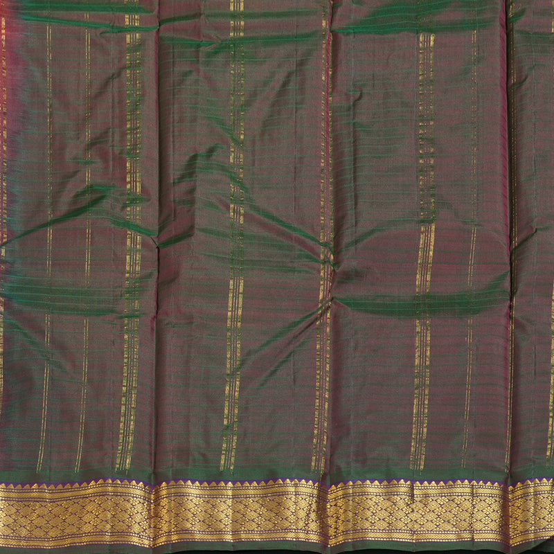 A dark maroon Kanjivaram Silk Saree featuring striking lines across the body and a rich purple border. An exquisite saree that exudes sophistication, perfect for weddings and traditional events.