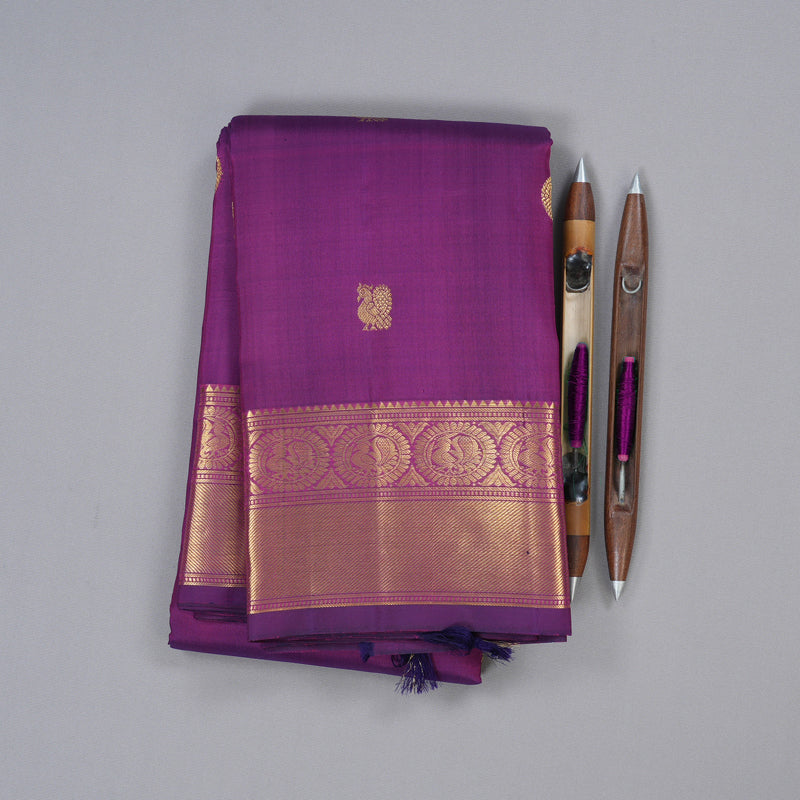 An ode to craftsmanship, this Dark Purple Handloom Kanjivaram Silk Saree is adorned with Peacock Buttas on the Body and Border, symbolizing grace and prosperity. A must-have for those who cherish timeless weaves with intricate detailing.