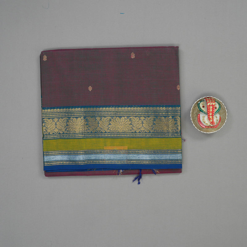 A deep, striking contrast defines this elegant Dual Tone (Purple & Green) Pure Chettinad Cotton Saree, framed by a deep Blue Border. This Pure Cotton Saree features delicate floral buttas on the border.