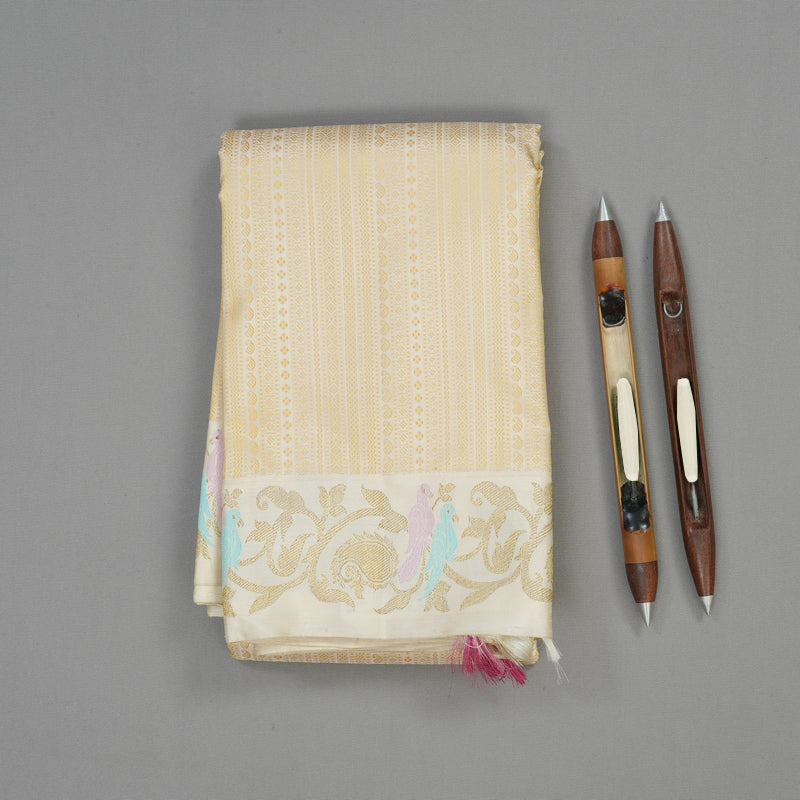 This saree is an elegant textile, likely a traditional saree, in a soft, monotoned creamy off-white or light beige color. The fabric possesses a delicate shimmer, enhanced by a subtle, repeating pattern of vertical textured stripes running across the material. This body fabric is framed by clean, plain white bands at the top and bottom, which function as borders. Woven into these simple borders, are small, decorative motifs resembling a paisley or a stylized peacock, rendered in muted pastel shades of light blue, lavender, and soft green/gold, adding a touch of traditional artistry to the otherwise serene and sophisticated composition.