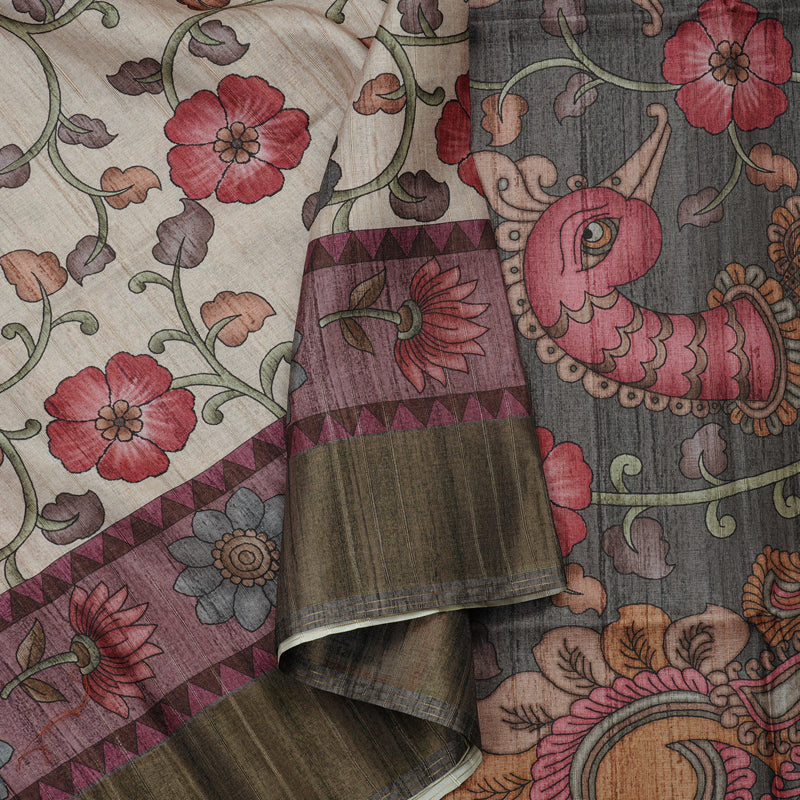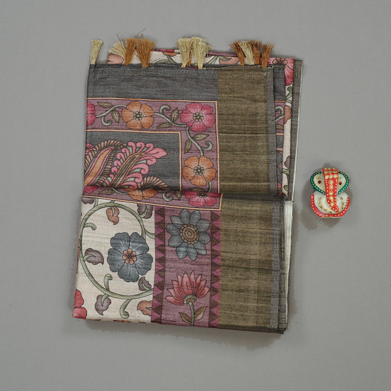 This fancy cotton saree comes in a half-white body paired with a muted grey border, pallu, and blouse, creating a soft, earthy contrast. The pallu is beautifully adorned with traditional floral prints in pastel tones of pink, grey, and orange, highlighted further by charming peacock designs.