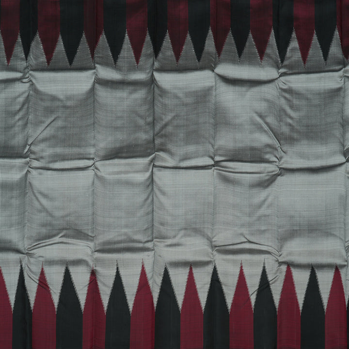 A contemporary take on tradition, this threadwork Kanjivaram silk saree comes in a muted grey with striking black and maroon temple-style borders. Understated and artistic, this saree is perfect for formal occasions with a touch of spiritual symbolism.