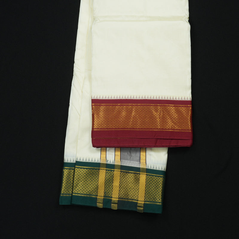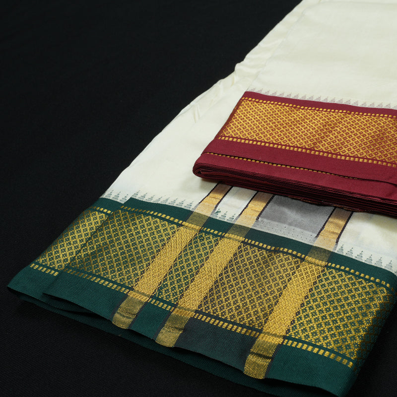 A Handwoven Silk Dhothi. The dhotie has mayil kann design on the border. The borders are green and maroon red respectively. It is suited for all occasions.