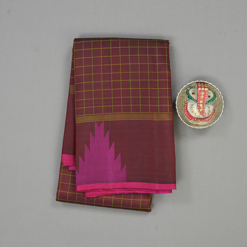 Discover the earthy elegance of this Hayagrivas Handloom Brown Kanjivaram Silk Saree. This traditional Kanjivaram Silk Saree features fine Thread Work checks woven across the entire body, creating a subtle, rich texture. The border is adorned with traditional rekku motifs, adding an element of classic design to the piece. This is a sophisticated and unique choice, perfect for those searching for brown Kanjivaram, Thread Work checks silk saree, and rekku motifs Kanchipuram.