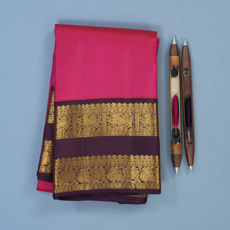 This Handloom Kanjivaram features a majestic dark pink body, offering a deep and regal radiance. The rich silk perfectly captures the soulful essence of South Indian heritage through its smooth, luxurious texture and timelessly elegant drape.