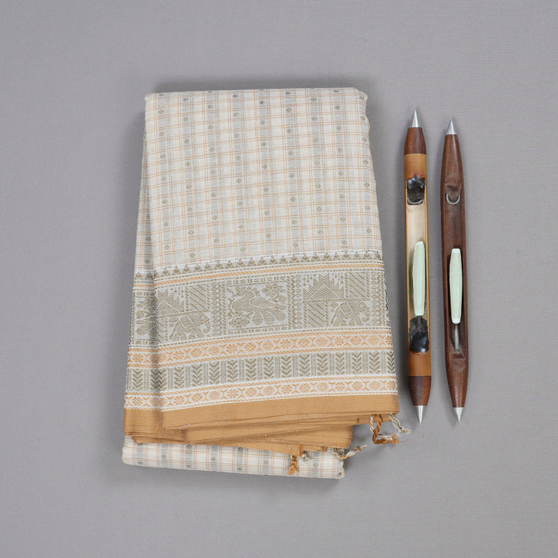 A Handwoven Kanchi Cotton Saree . Here is a splendid Beige with sandal border kanchi cotton saree. The body has thin lined checks with button pattern within. The pallu is rich and elegant . The border is in thread too like the pallu. Beat the heat with Hayagrivas's comfortable Kanchi cotton saree
