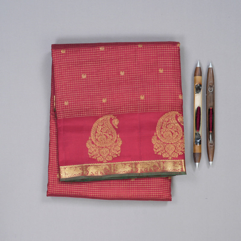 This maroon handloom ten yards Kanjivaram silk saree is a true embodiment of tradition and grandeur, woven with intricate craftsmanship and a regal color palette. The deep maroon body is adorned with fine gold zari checks, lending a structured elegance to the drape. Scattered across the checks are small peacock motifs in zari, adding a delicate yet majestic touch. Above the border, the saree is further embellished with paisley mango buttas, a symbol of prosperity and timeless beauty.