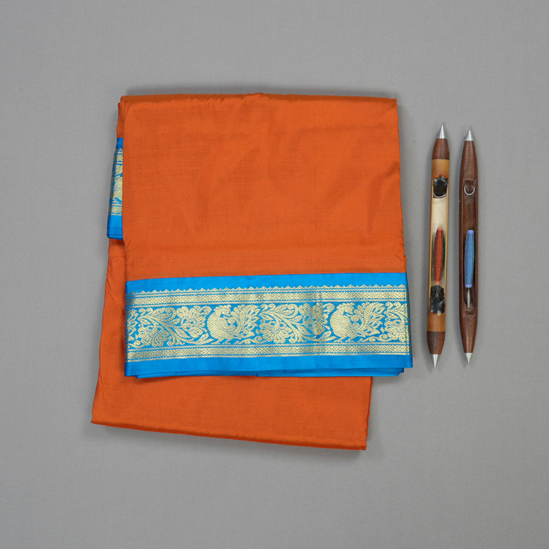 Experience the timeless elegance of the Hayagrivas Handloom Kanjivaram Nine Yards Silk Saree, crafted in a rich rust orange hue complemented by a striking sea blue border. This exquisite saree showcases the finest handwoven silk, renowned for its durability and lustrous finish.