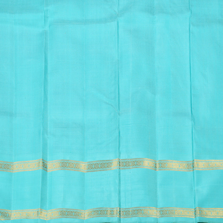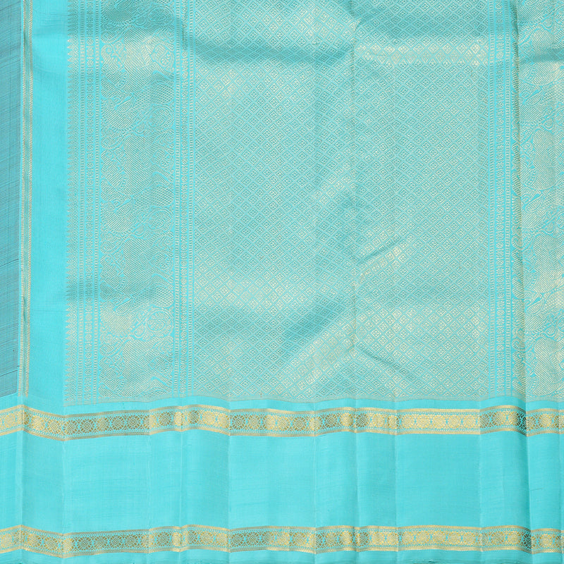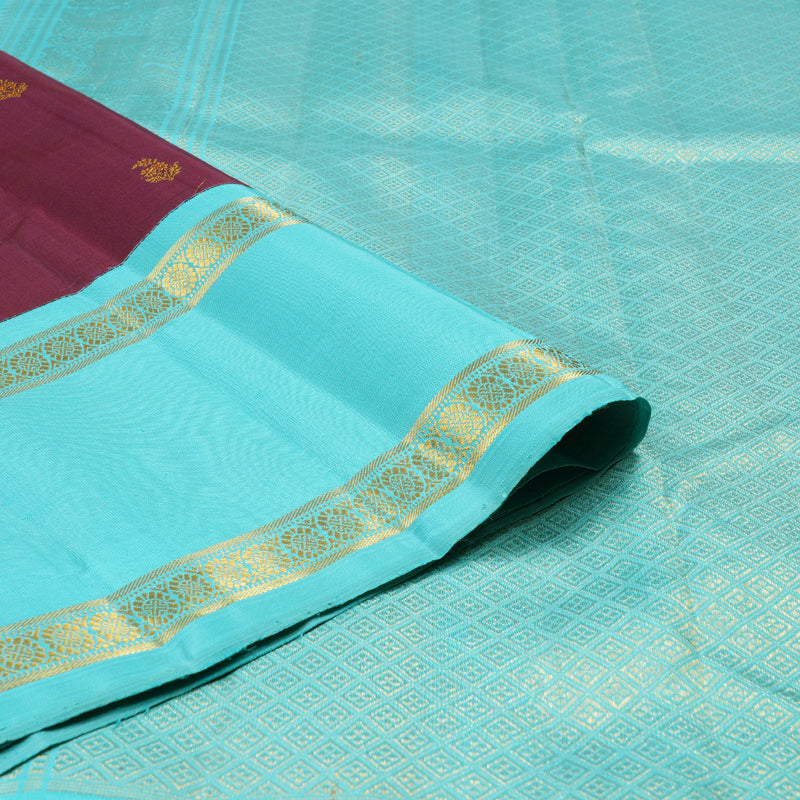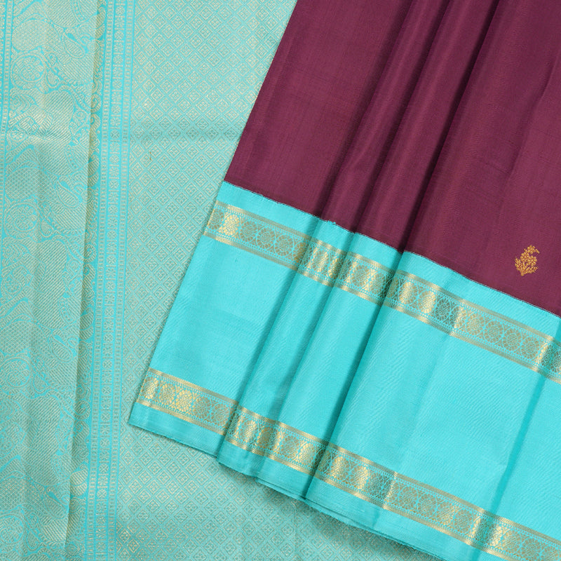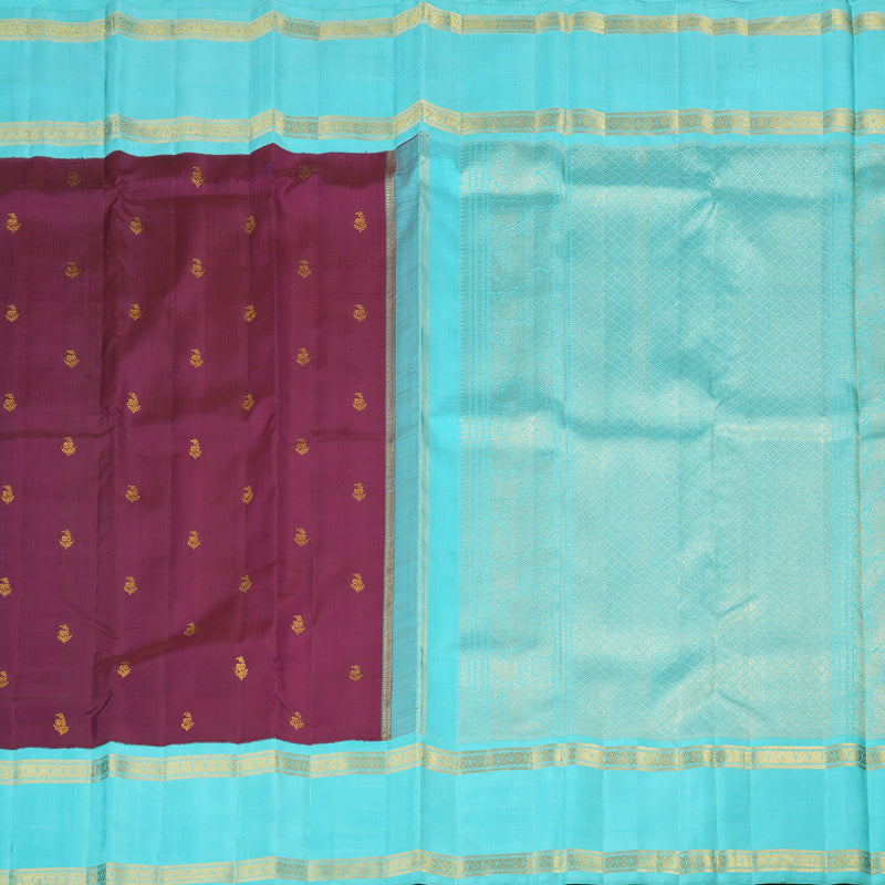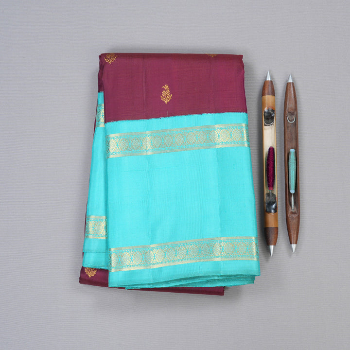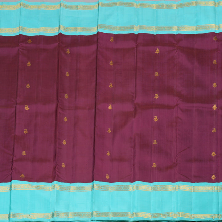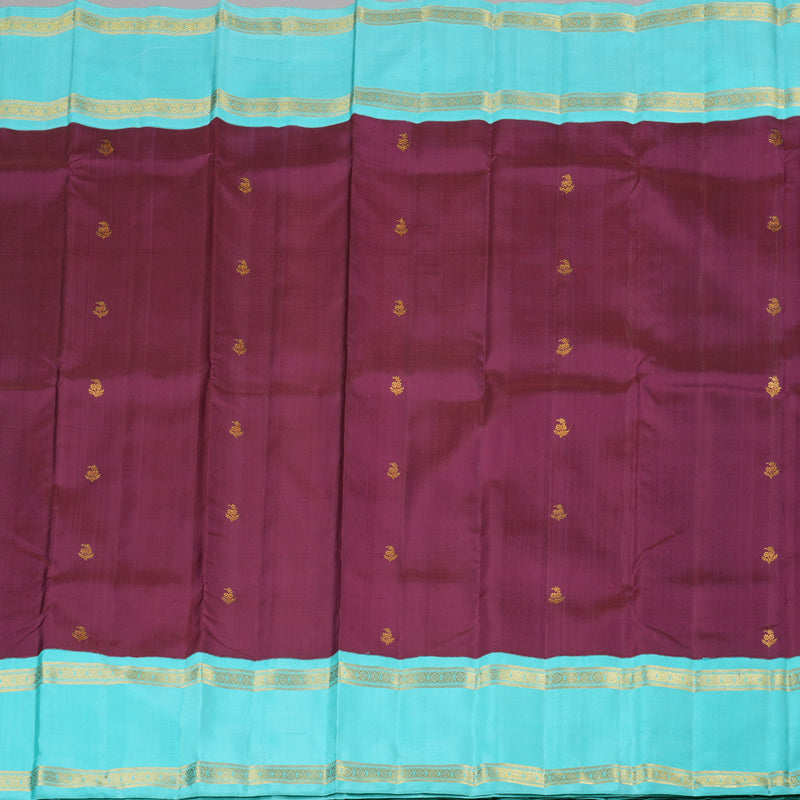 The saree features a matte purple body, offering a soft yet regal look. The golden zari floral motifs delicately woven across the fabric add a subtle shimmer, enhancing its elegance. The border and pallu contrast beautifully in a vibrant aqua blue, creating a striking visual appeal. The golden zari borders and intricate detailing on the pallu further elevate its luxurious charm. This Korvai Retta Pettu handloom Kanjivaram silk saree embodies a perfect blend of rich tradition and sophisticated aesthetics.