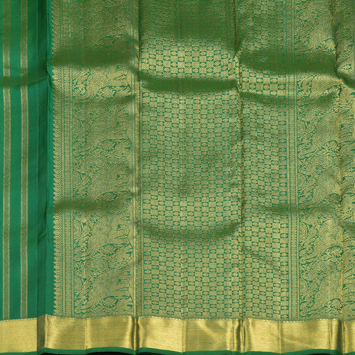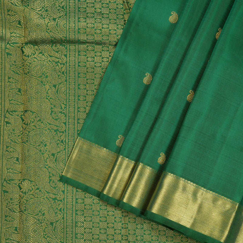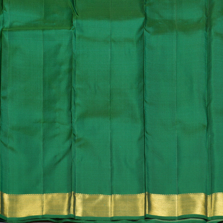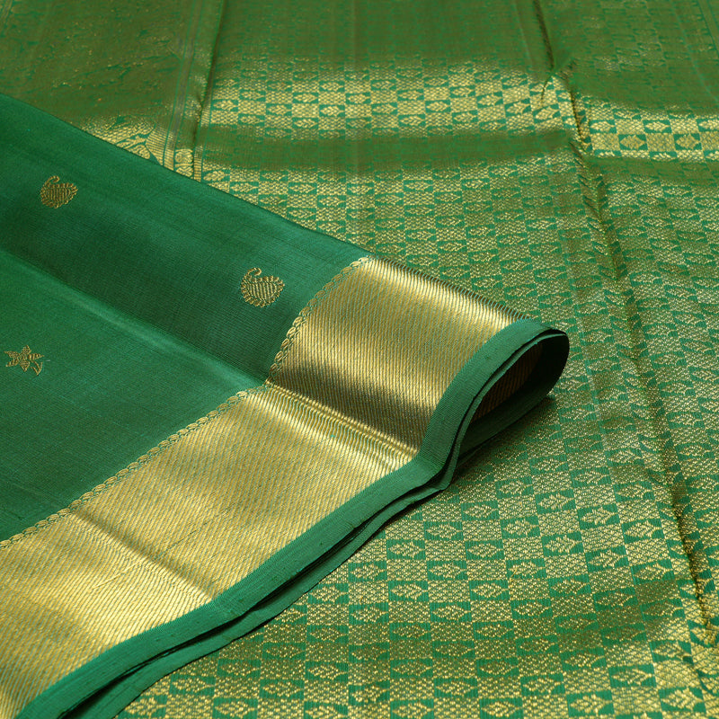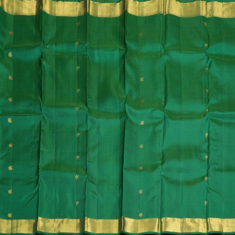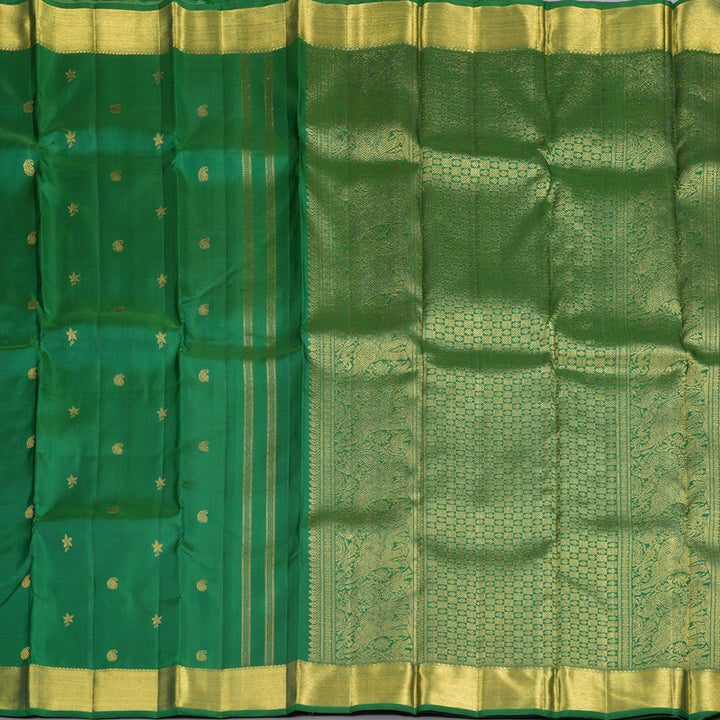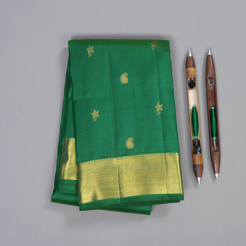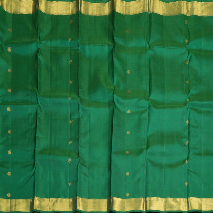 This handloom Kanjivaram silk saree is a mesmerizing piece in a rich leaf-green hue, exuding grace and tradition. The body is adorned with delicate gold motifs, including small mango and star buttas, adding a touch of elegance. The wide golden border and intricately woven pallu enhance the regal charm of the saree, showcasing fine craftsmanship. The luxurious silk texture and detailed zari work make it an ideal choice for weddings, festivities, and grand celebrations. This saree is a perfect blend of heritage and sophistication, reflecting the timeless beauty of Kanjivaram weaves.