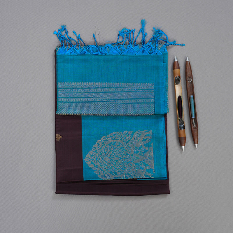 Rich and earthy, this dark brown handloom Kanjivaram soft silk saree features a contrasting dark sky blue border. The fine weaving showcases traditional motifs, making it a unique piece that blends classic artistry with modern appeal, perfect for any grand occasion. The border has jari buttas with floral and elephant pattern