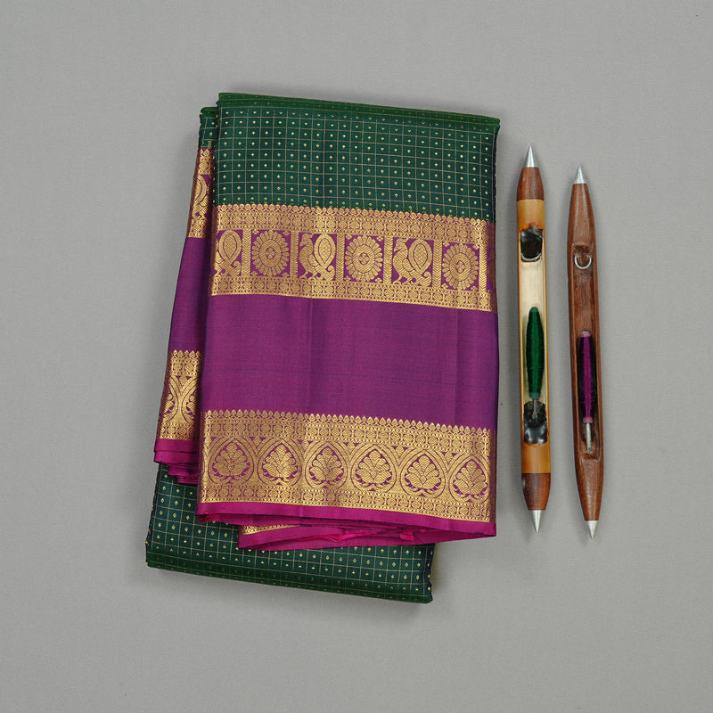A striking peacock green Kanjivaram silk saree that immediately catches the eye with its bold and vibrant charm. The deep purple border is rich with traditional motifs, finished with intricate golden zari work that beautifully frames the saree.