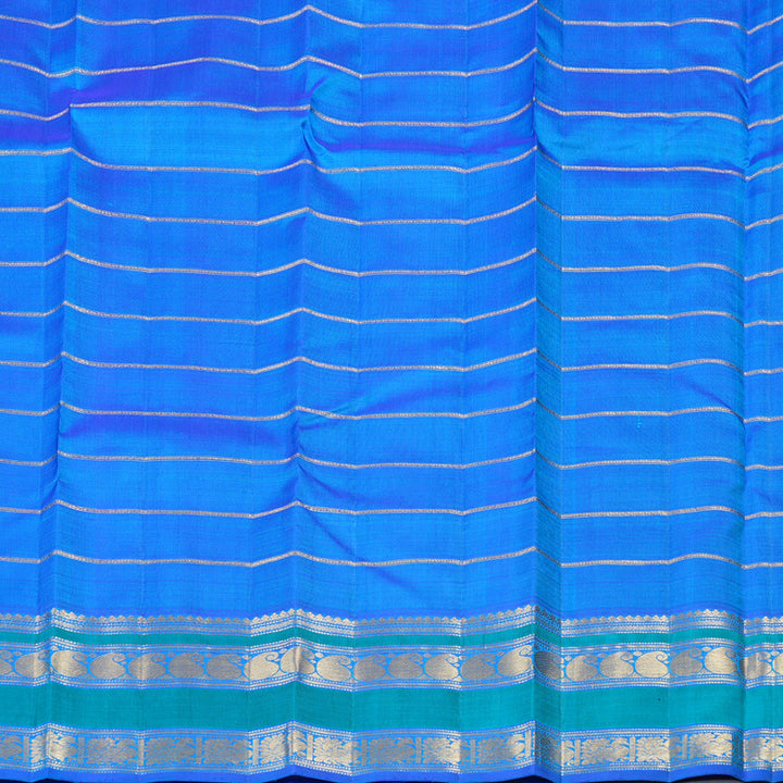 This Kanjivaram silk saree is a bridal dream, woven in silk, as some sarees don’t just drape; they create an aura. This sea-green Kanjivaram silk saree is one such masterpiece—a vision of elegance that belongs in a bride’s trousseau. The sea green body, adorned with delicate golden zari lines, flows into a resplendent sea blue pallu, shimmering like moonlight on water.