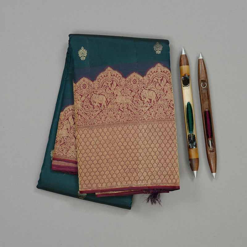 The deep bottle green body, sprinkled with intricate gold buttas, feels timeless, while the broad wine-maroon border steals the show with grand traditional motifs and temple designs. The pallu, drenched in wine maroon and richly woven with gold, brings a majestic feel to the entire look.