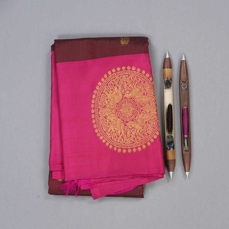 This vintage Kanjivaram silk saree is one of those rare pieces that gets your attention right away. The deep dark maroon body carries a subtle texture, giving it a rich, elegant feel, while the reddish pink border, pallu, and blouse create a striking contrast that’s both bold and beautiful.