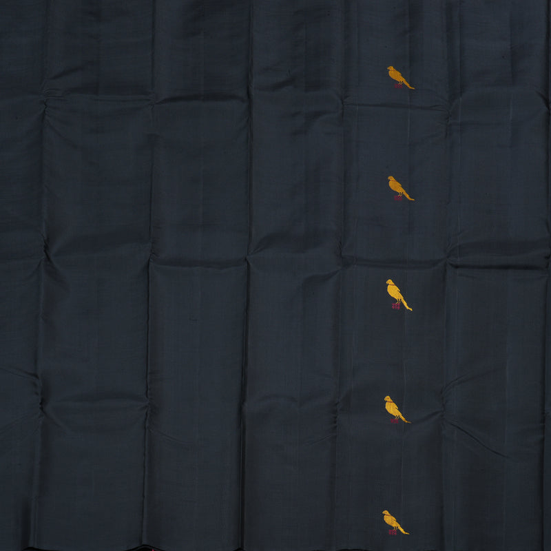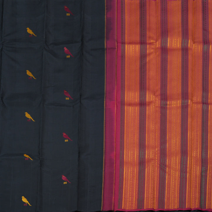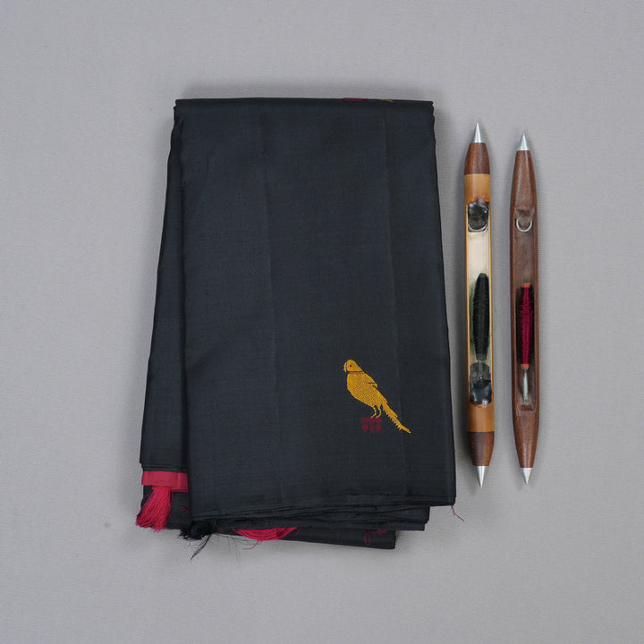 This contemporary Kanjivaram silk saree is a perfect blend of tradition and modern aesthetics. The rich black base gives it a bold and timeless appeal, while the charming mustard and red bird motifs scattered across the fabric add a whimsical touch. This is not just a saree—it’s a statement of understated elegance with an artistic flair.
