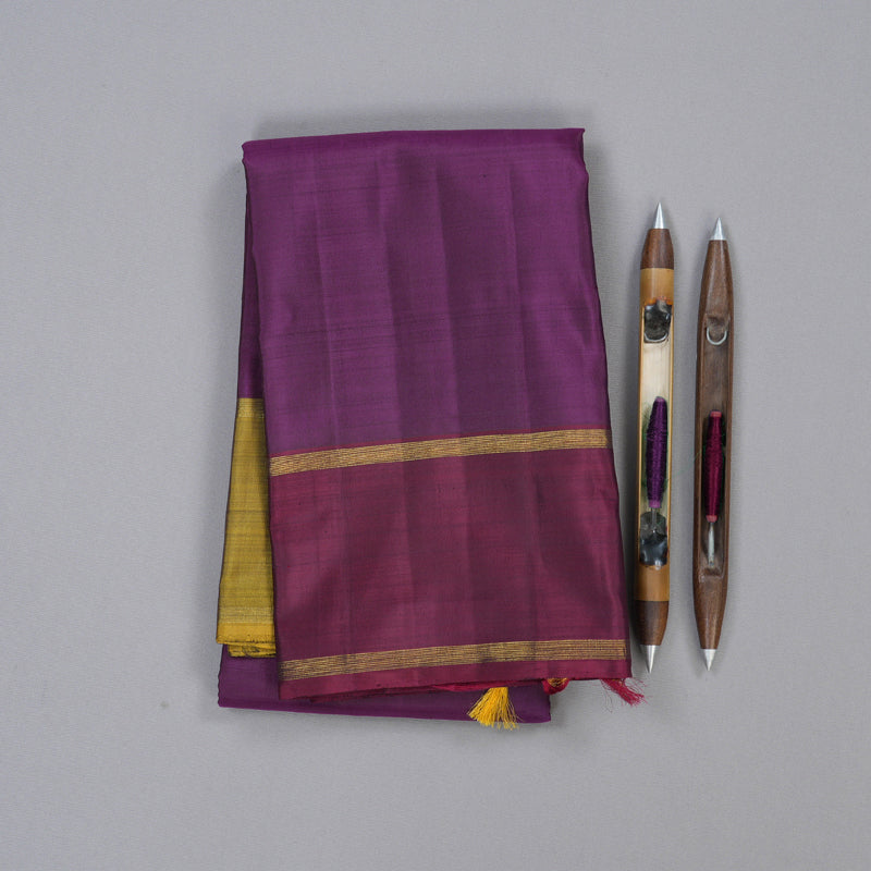 Of all the sarees in your collection, this Kanjivaram silk saree is bound to spark the most conversations. The rich purple hue instantly commands attention, while the Ganga Jamuna border—one side glowing in Sampanga yellow and the other in deep wine maroon—creates a striking contrast that feels bold yet effortlessly elegant.