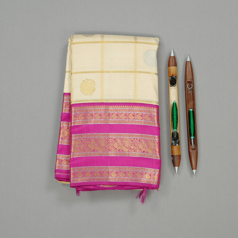 A beautiful Kanjivaram silk saree that captures the essence of elegance and vibrancy together. The body comes in a soothing sandal shade with subtle golden checks and delicate designs that offer a soft, graceful appeal.