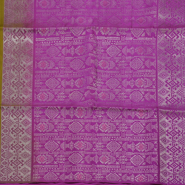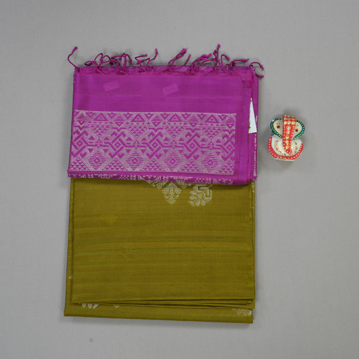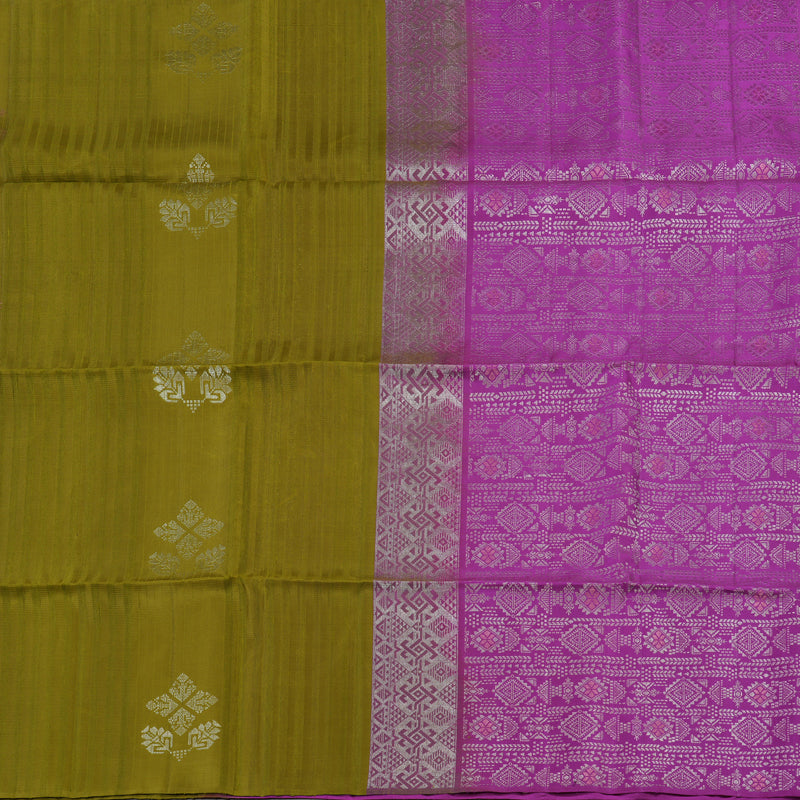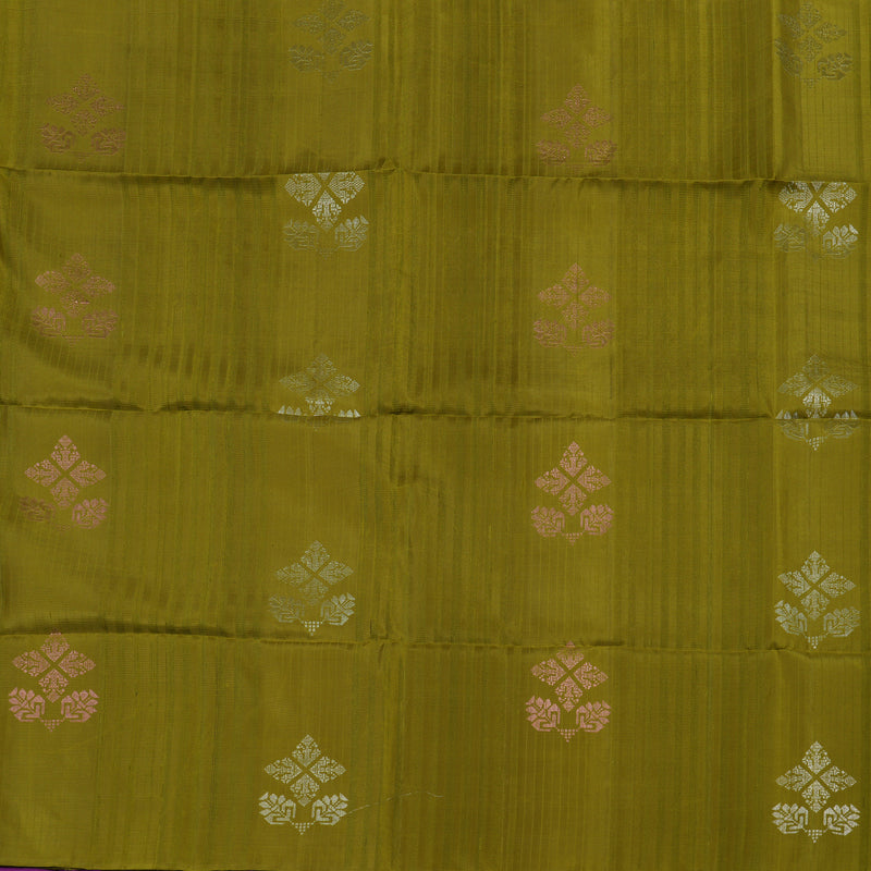 Experience the timeless elegance of the Hayagrivas Handloom Kanjivaram soft silk saree in a rich olive green shade, beautifully enhanced with silver and gold tested zari motifs intricately woven throughout the body.