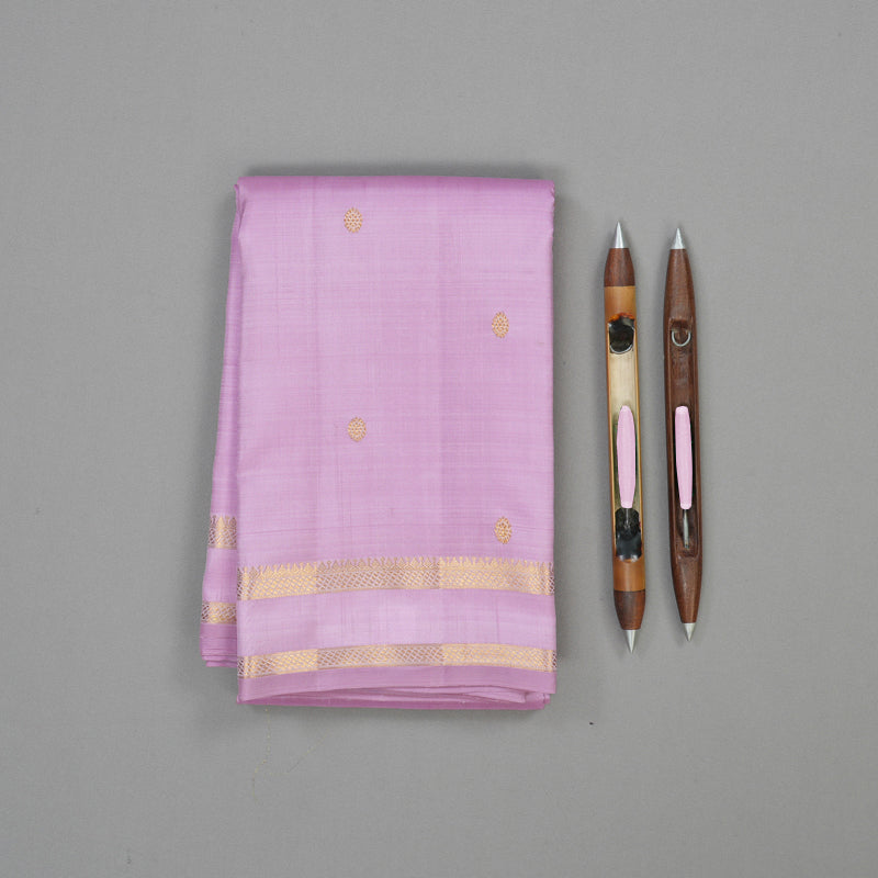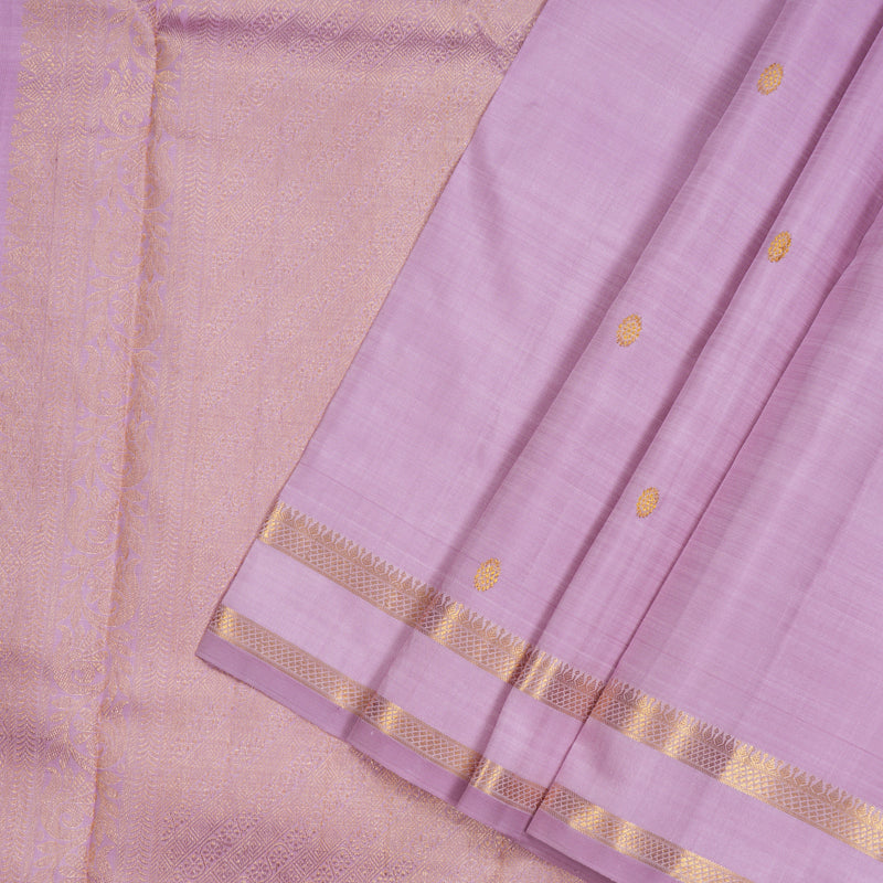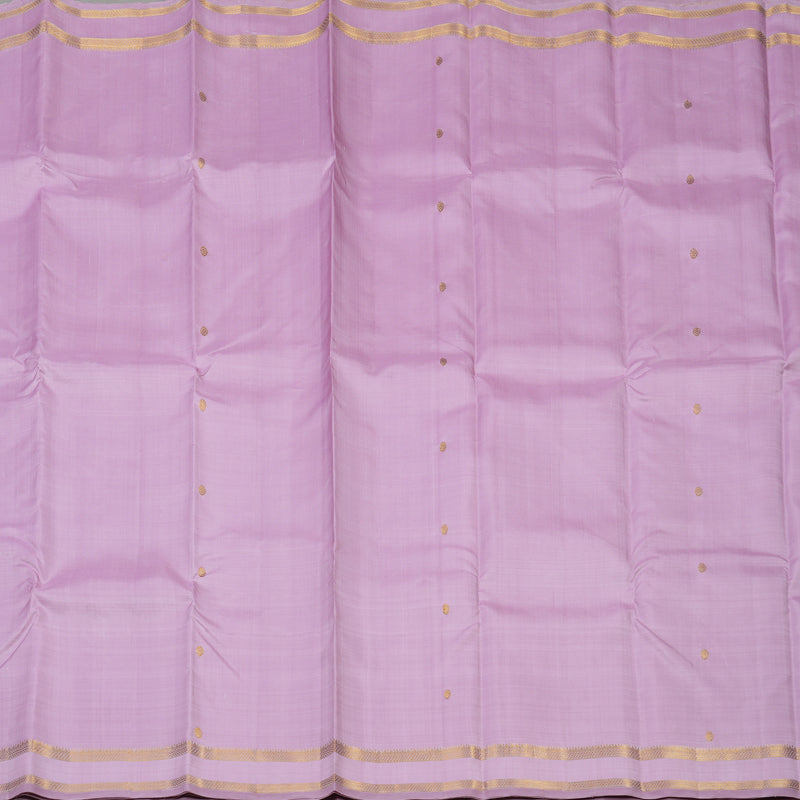 Step into a world of modern royalty with this mesmerizing Handloom Kanjivaram Silk Saree, presented in a dreamlike Lavender monotoned hue. The saree exudes a seamless elegance, with the entire drape bathed in this soft, sophisticated shade. Its body is beautifully adorned with chakram buttas, adding a touch of traditional symbolism and a subtle sparkle to the rich silk texture.