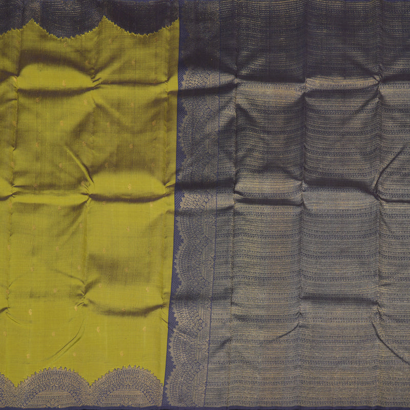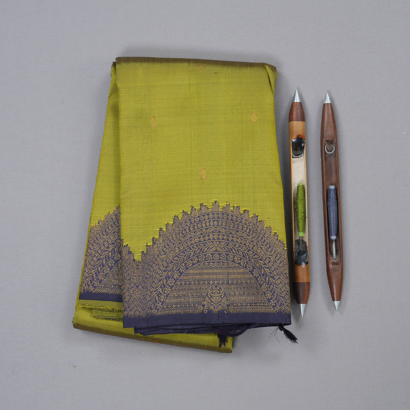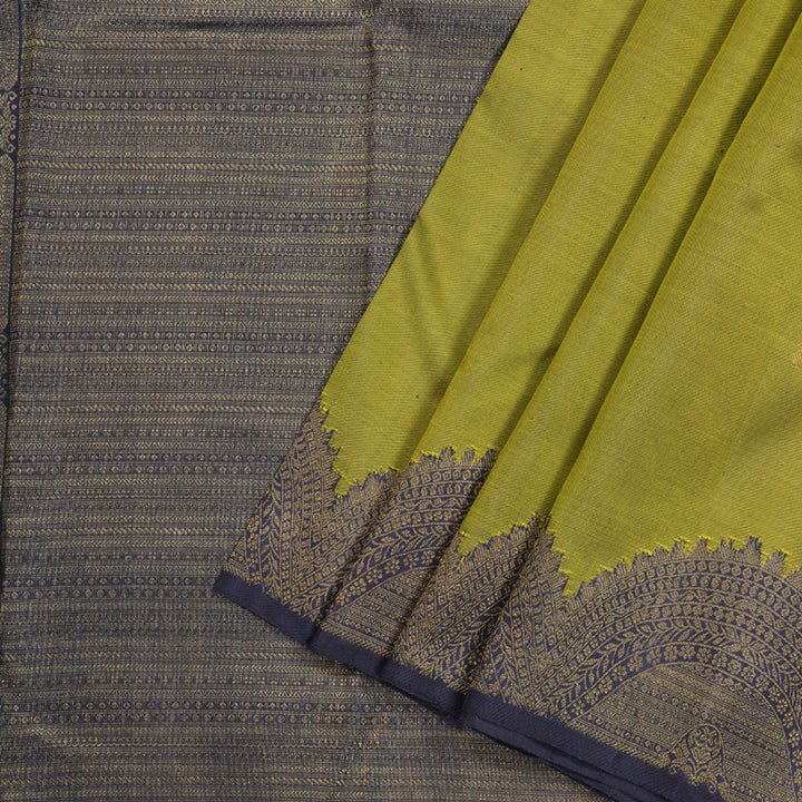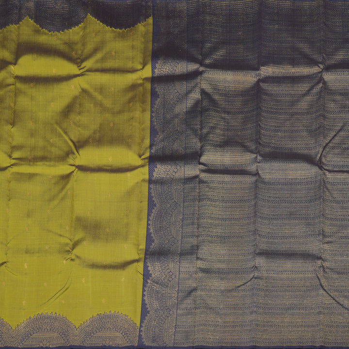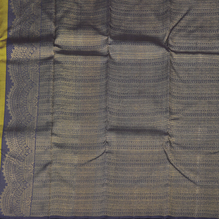 This kanjivaram silk saree showcases an exquisite handwoven silk saree, blending rich black-toned snuff shades on the pallu and border with a golden mehendi-hued body, creating a mesmerizing contrast.