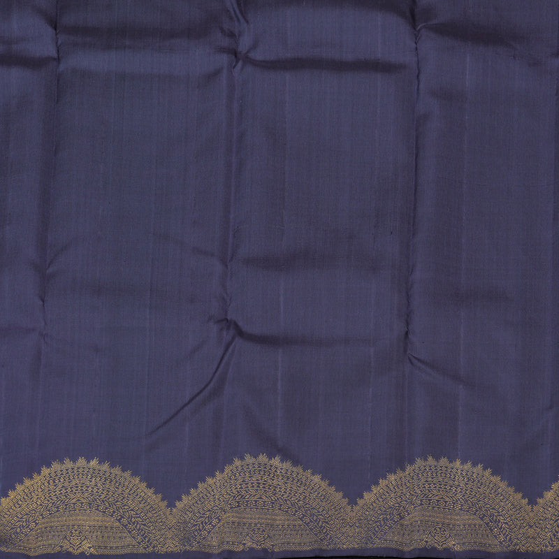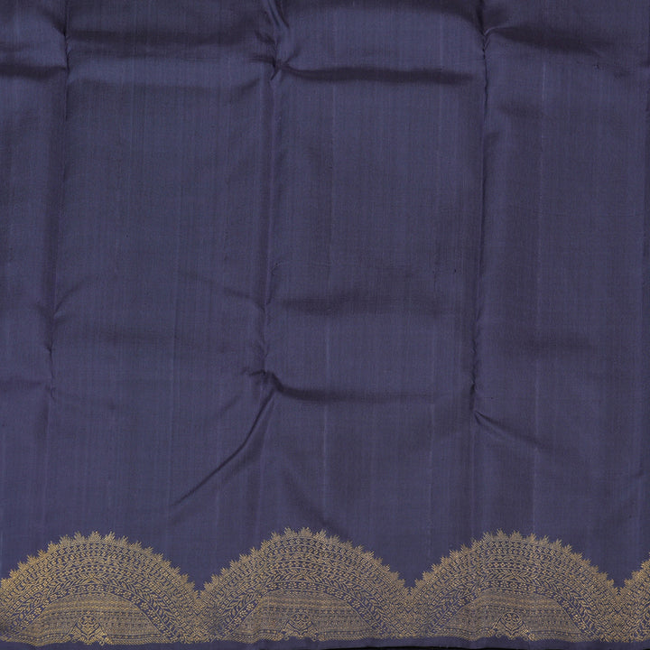 In stark contrast, the pallu and border are enveloped in a deep snuff shade with black undertones, exuding a refined and mysterious allure. The pure jari (zari) weaving enhances the elegance, featuring intricate patterns that shimmer gracefully against the dark backdrop. The turning border design ensures a seamless and flowing transition of motifs, embodying the meticulous craftsmanship of traditional weaving.