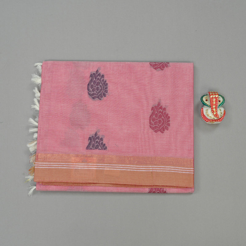 This pure cotton saree in soft baby pink feels like a warm, cheerful morning with delicate sandal-hued borders that bring a subtle glow to the whole look. Across the body are woven motifs in maroon and violet, giving it a gentle charm without going over the top.